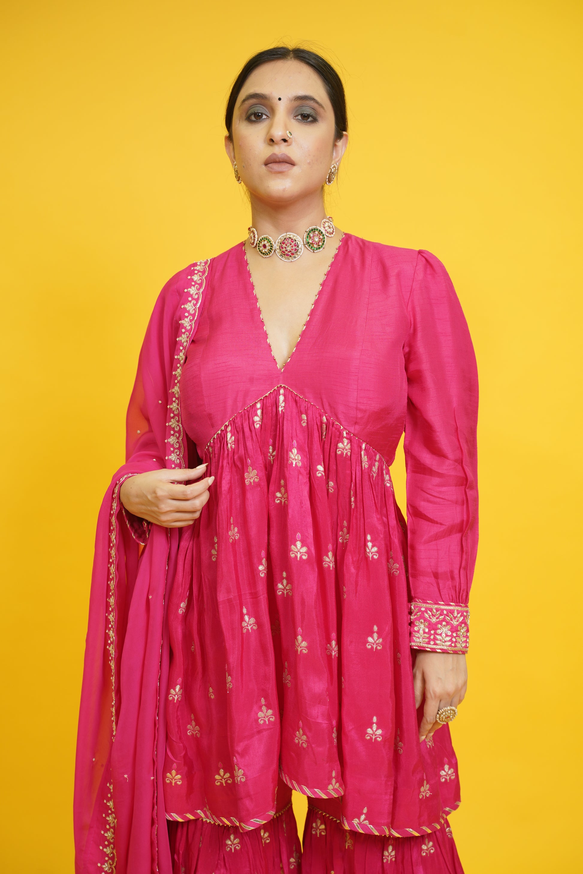 Featuring a pink meenakari sharara paired with puplum top. The ensemble is topped with by an intricately hand-embroidered dupatta.