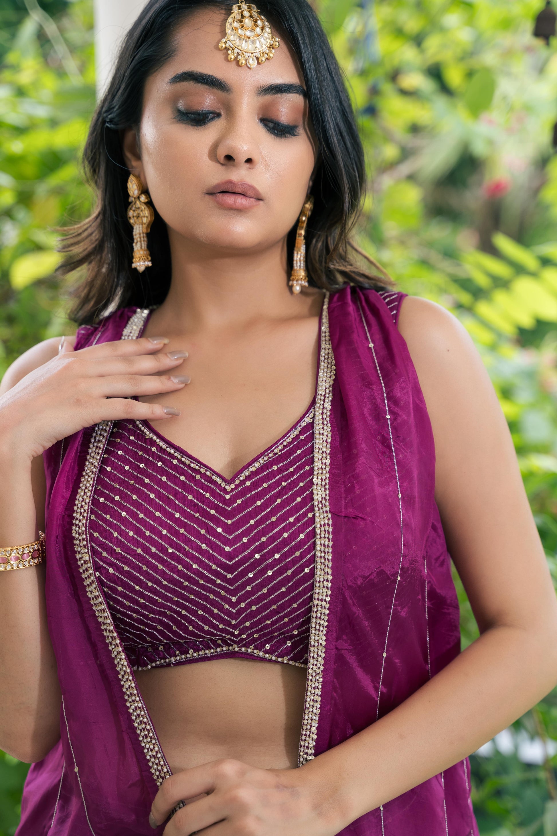 Flared satin pants are paired with V neck sleeveless blouse with silver hand embroidery which is further topped with tabby silk jacket.