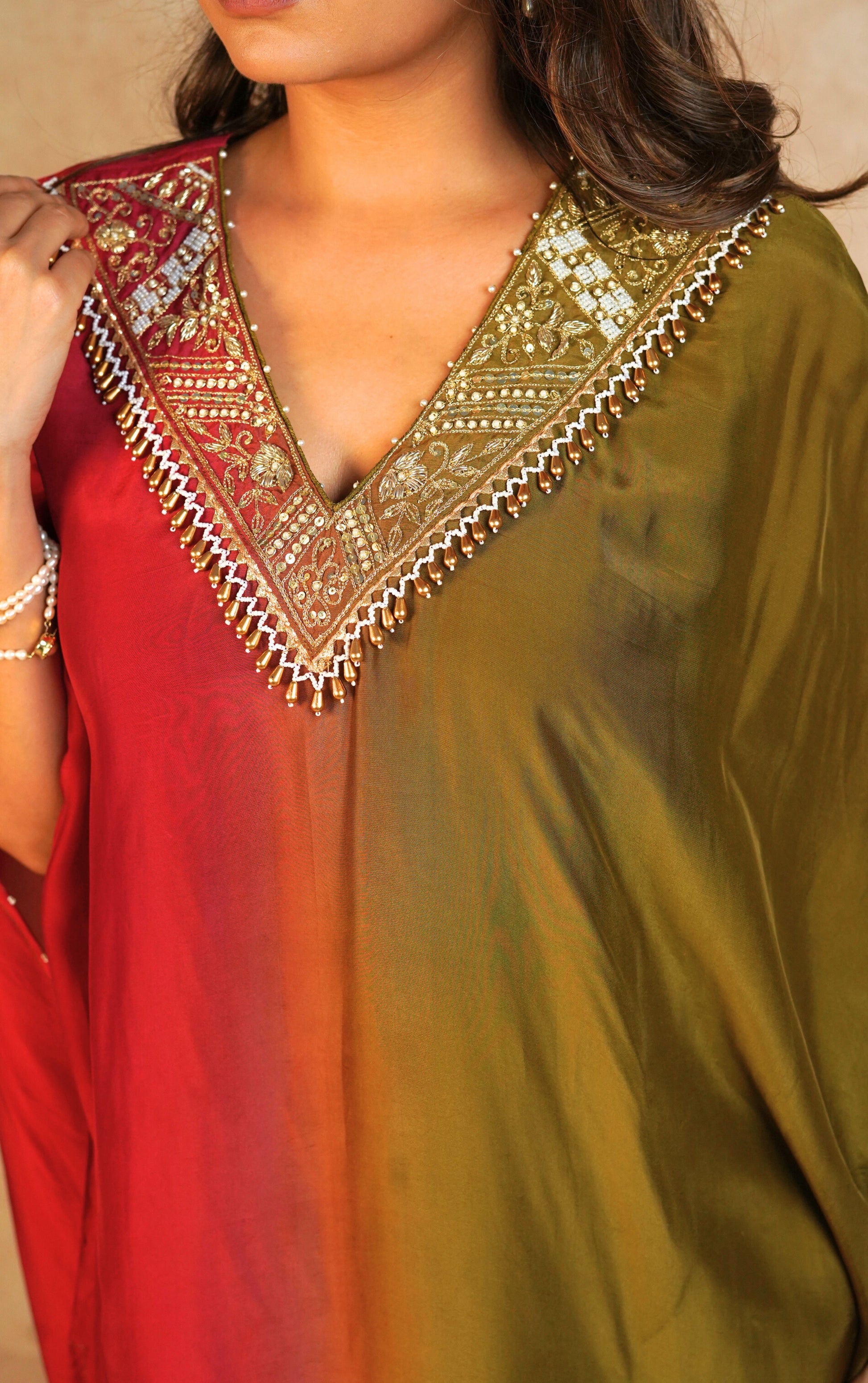 Ombré kaftan in soft flowy fabric, adorned with pearl and golden zari work. Comes with a matching plain inner