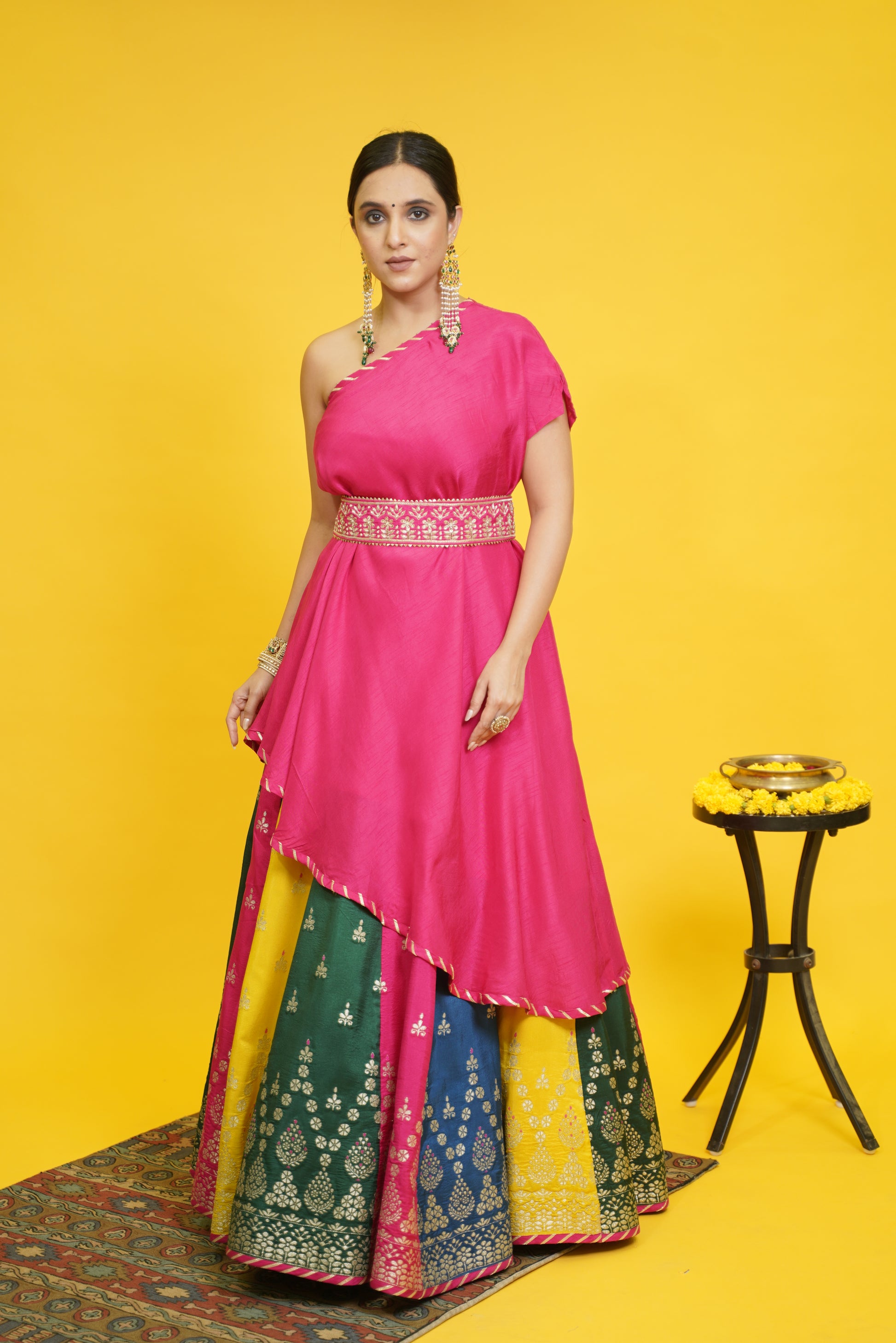 Multicoloured meenakari lehenga is paired Asymmetric plain dola silk top complimented with intricately hand embroidered belt.