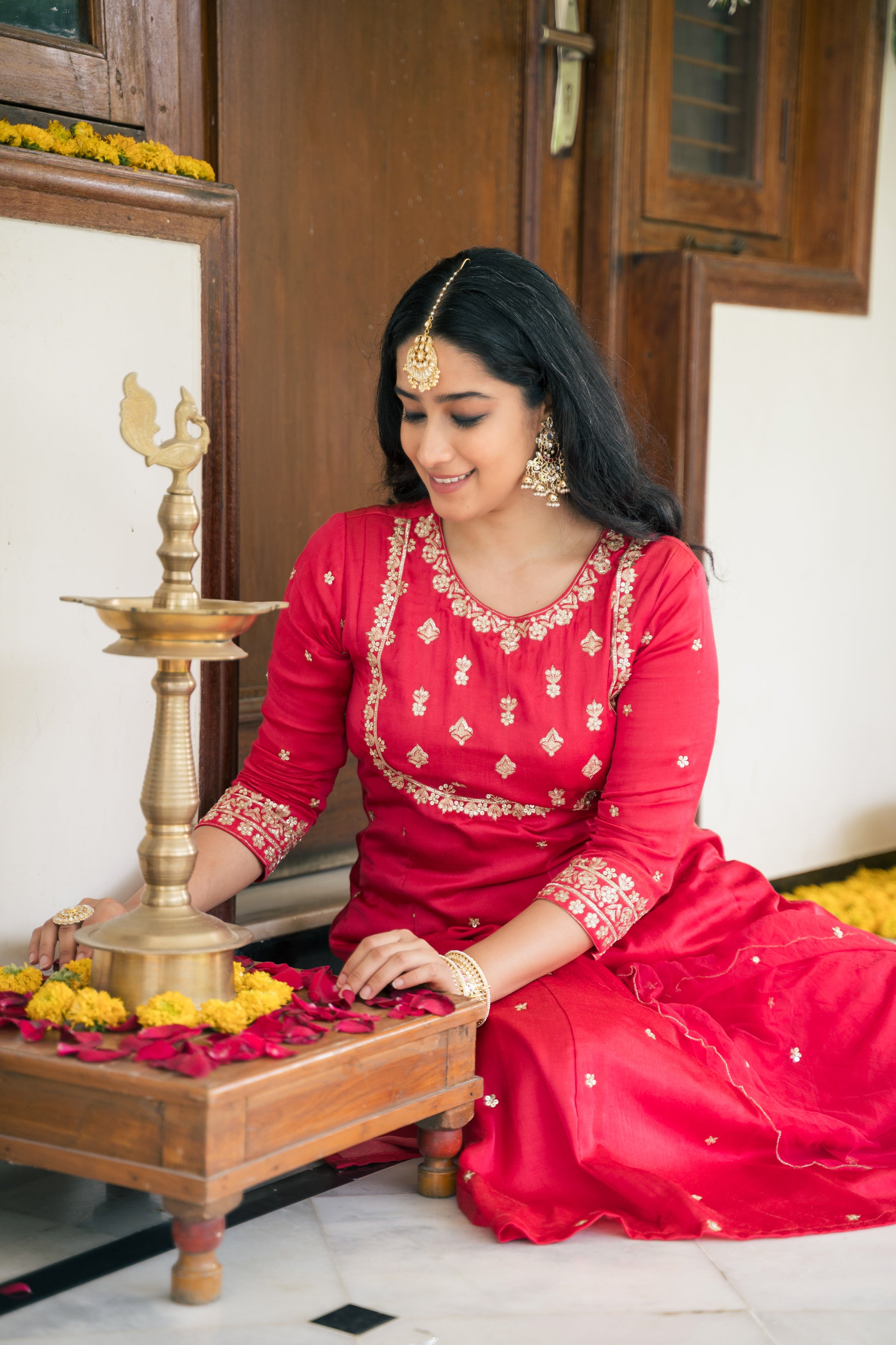 Beautifully adorned Satin Silk Kurta with hand embroidery is paired with cotton silk pants and net dupatta that is finished with hand embroidered scalaps!