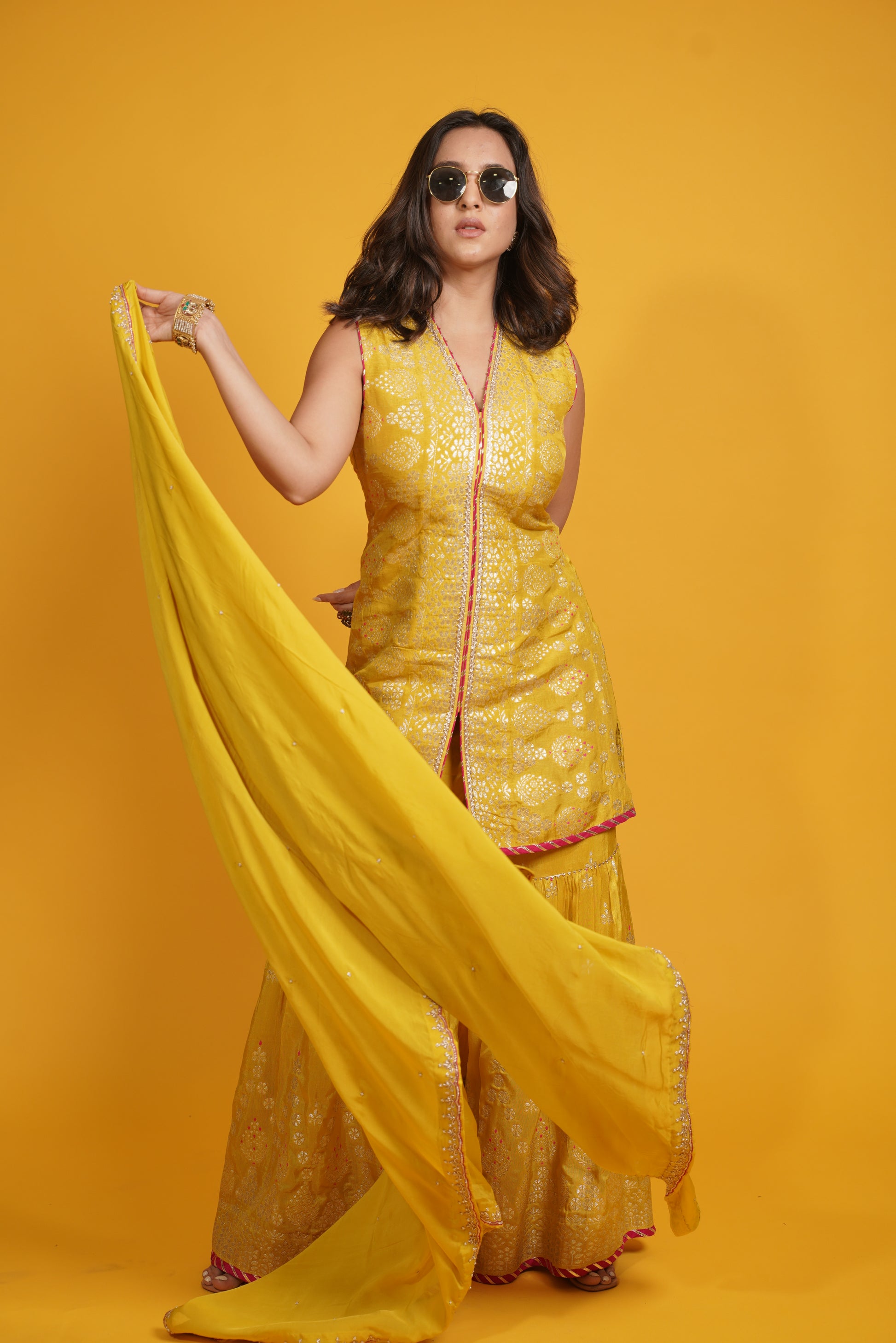Featuring a vibrant yellow meenakari sharara paired with a front open kurta set. The ensemble is enhanced by an intricately hand-embroidered dupatta.
