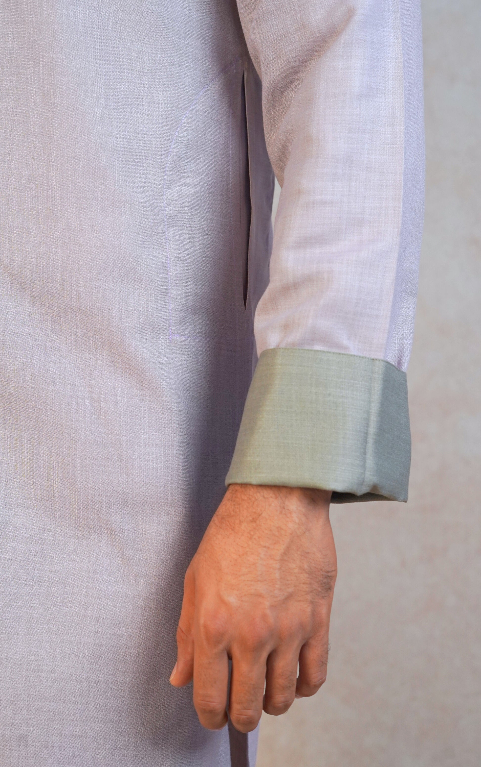 Long front-open kurta set with pintucks and roll-up sleeves in soothing lilac hues